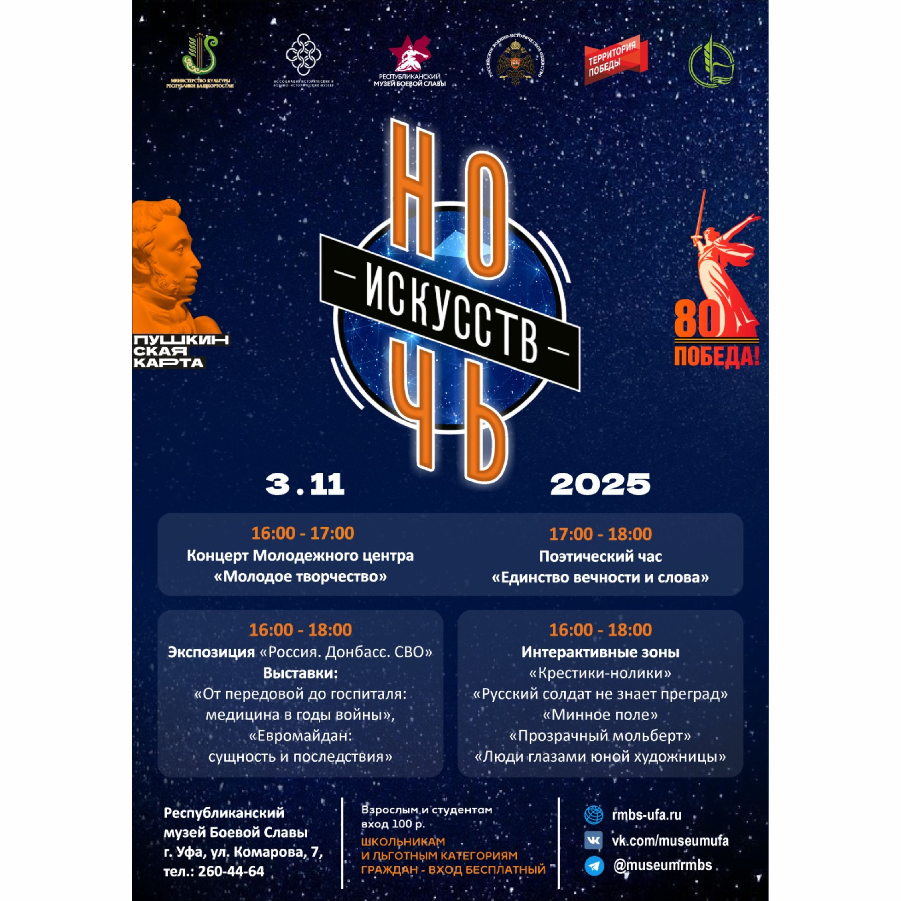 В "Ночь искусств" Республиканский музей Боевой Славы приглашает всех желающих окунуться в историю и культуру народа через уникальные экспозиции и тематические мероприятия. В программе — экскурсии по залам музея и ознакомление с новой экспозицией "Россия. Донбасс. СВО", а также выставками "От передовой до госпиталя: медицина в годы войны", "Евромайдан: сущность и последствия".