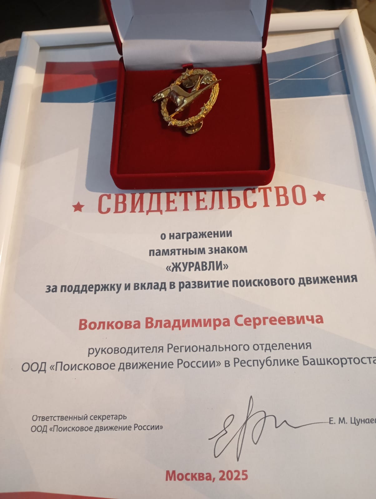 Памятный знак "Журавли" - главная награда Всероссийского поискового движения России, вручена научному сотруднику Республиканского музея Боевой Славы, руководителю регионального отделения "Поисковое движение России в Республике Башкортостан" Владимиру Волкову.